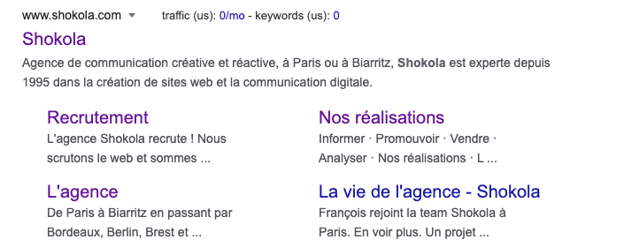 - Dans la balise « Title » et la « meta-description ». Kézako ? Ce sont les informations qui apparaîtront dans les résultats de recherche de Google. Voici un exemple pour le site de l’agence Shokola :