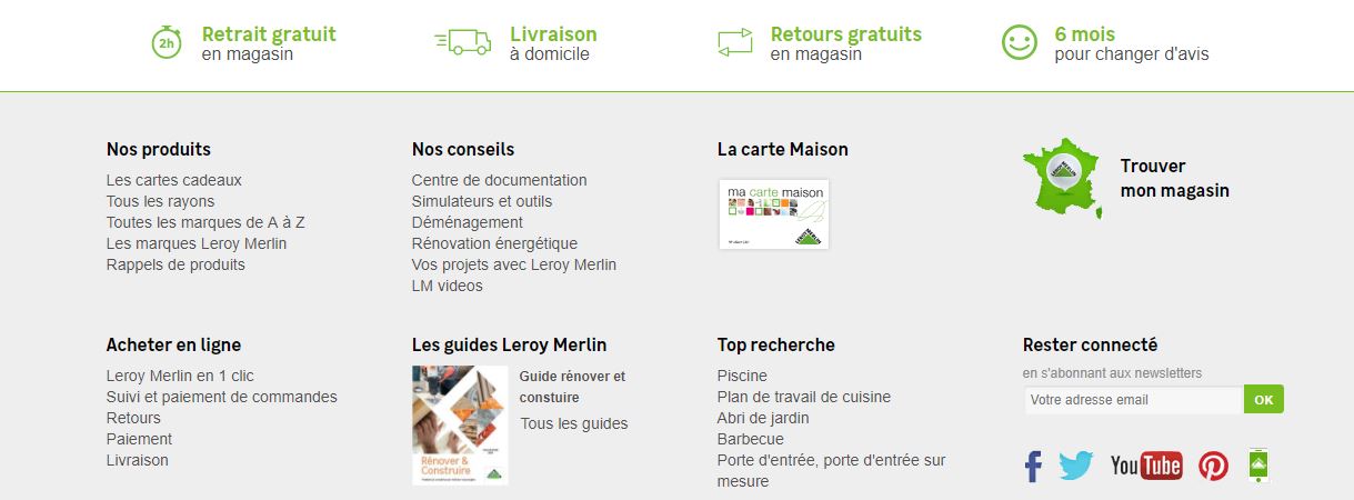 Ce bandeau de réassurance peut aussi se retrouver dans le bas de page (ou « footer »), comme chez Leroy Merlin ou la Fnac. Même si l’emplacement est plus bas, il est également judicieux, car on retrouve à cet endroit des liens vers la marque, un guide de taille ou encore des informations complémentaires aux produits.