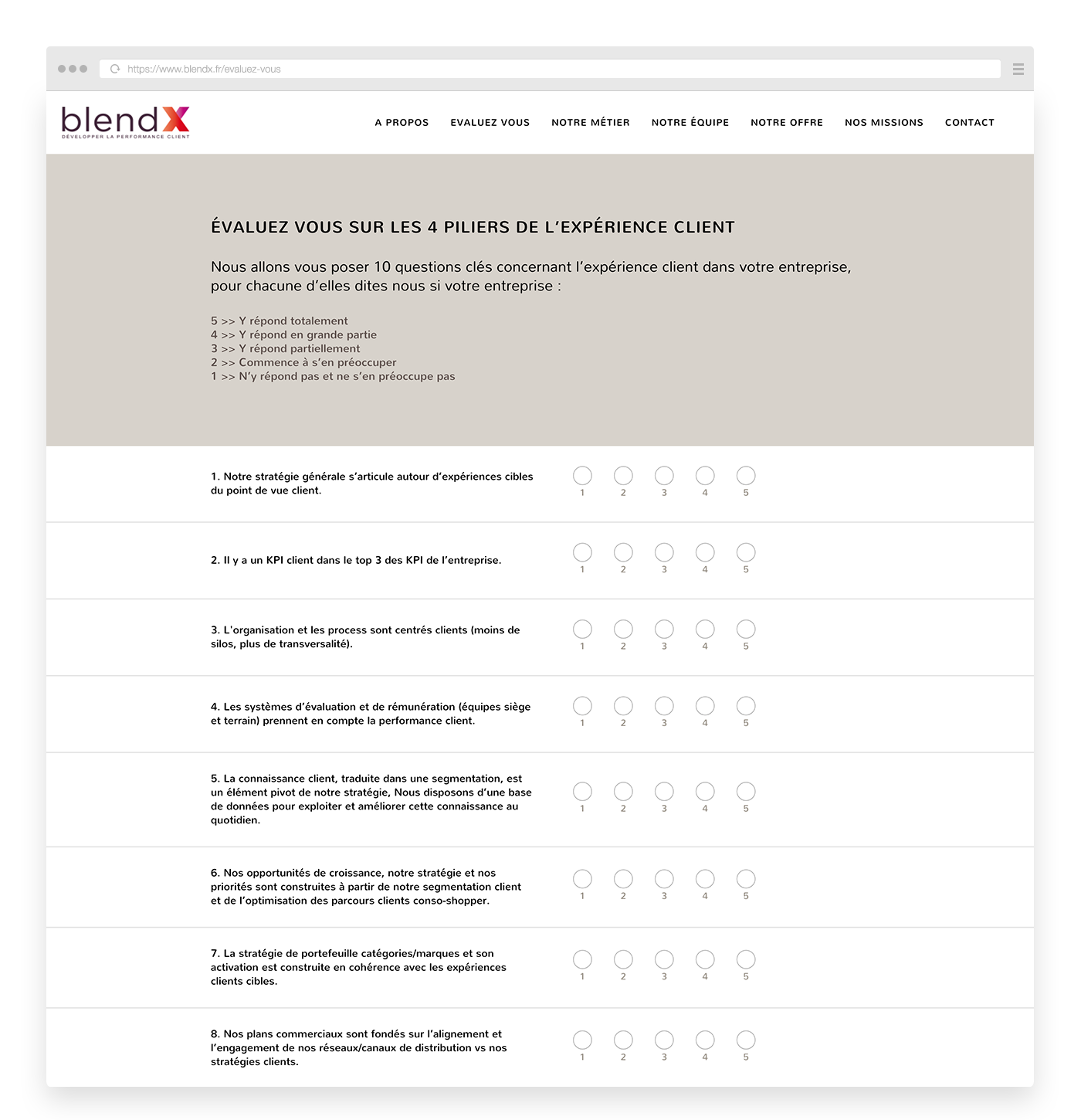 Nous avons développé ensemble un formulaire d’auto-évaluation basé sur 10 questions permettant à l’utilisateur de se faire une idée de son “positionnement” vis à vis des 4 piliers “clients”.