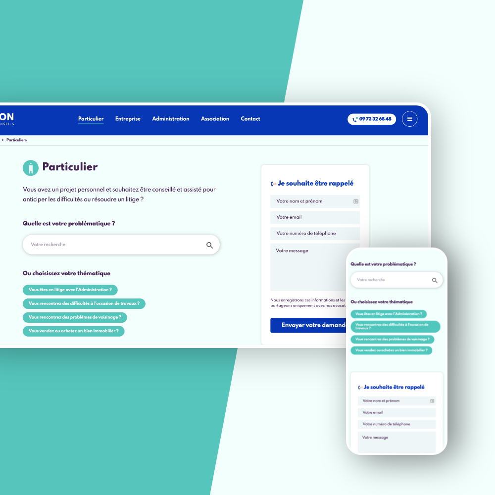 La structure et le design du site ont été pensés dans une approche UX. L’utilisateur doit sentir qu’il est sur le bon support pour trouver la meilleure solution à son problème (litige ou autre problématique).