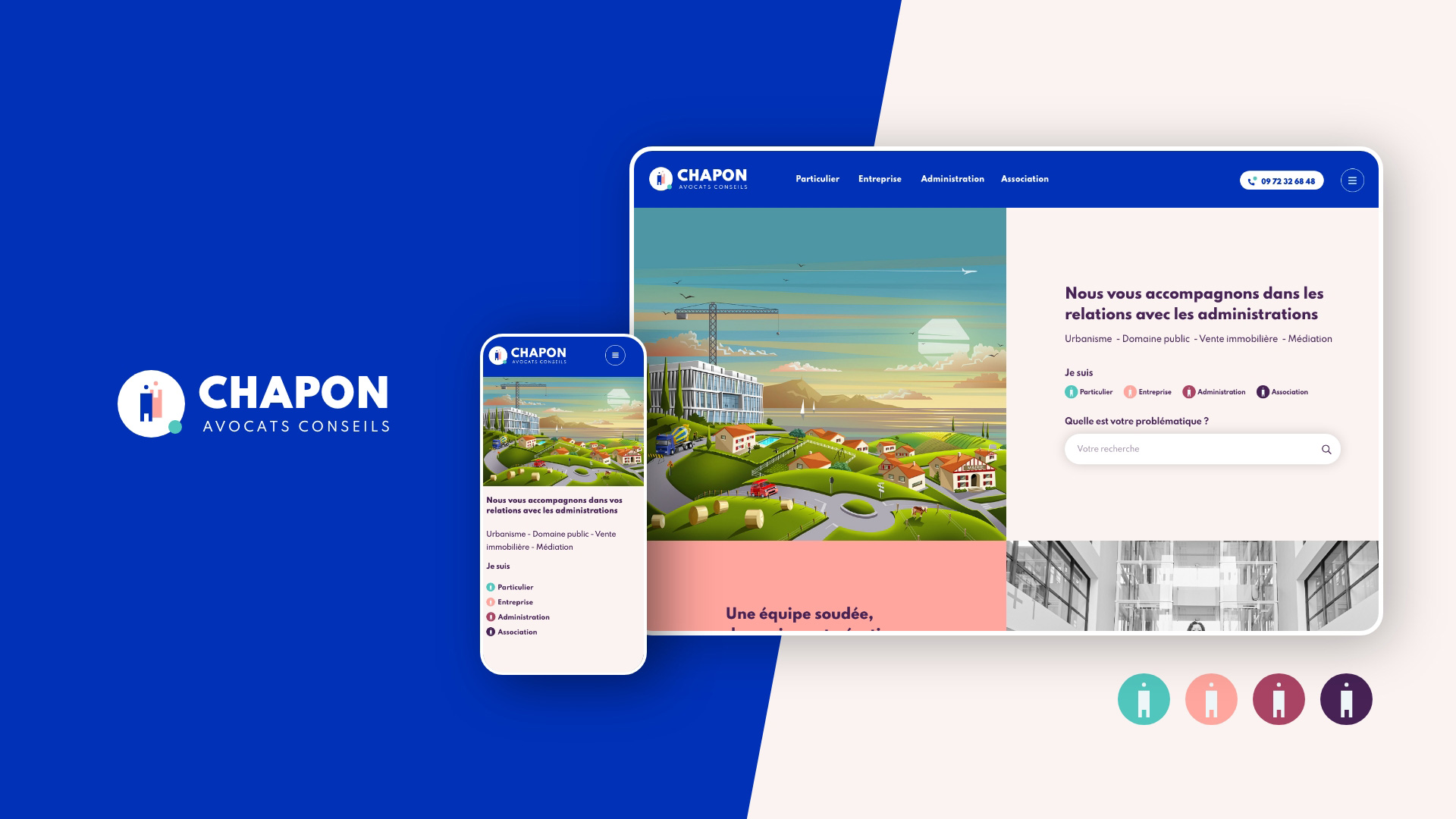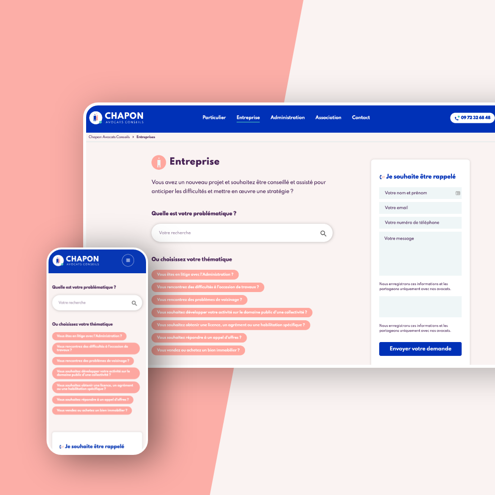 Chapon Avocats Conseils dispose d’une interface simple, moderne, efficace, et responsive. Les utilisateurs, grâce à une navigation fluide du site, accèdent rapidement à des réponses concrètes, et une prise de contact pour un accompagnement personnalisé.