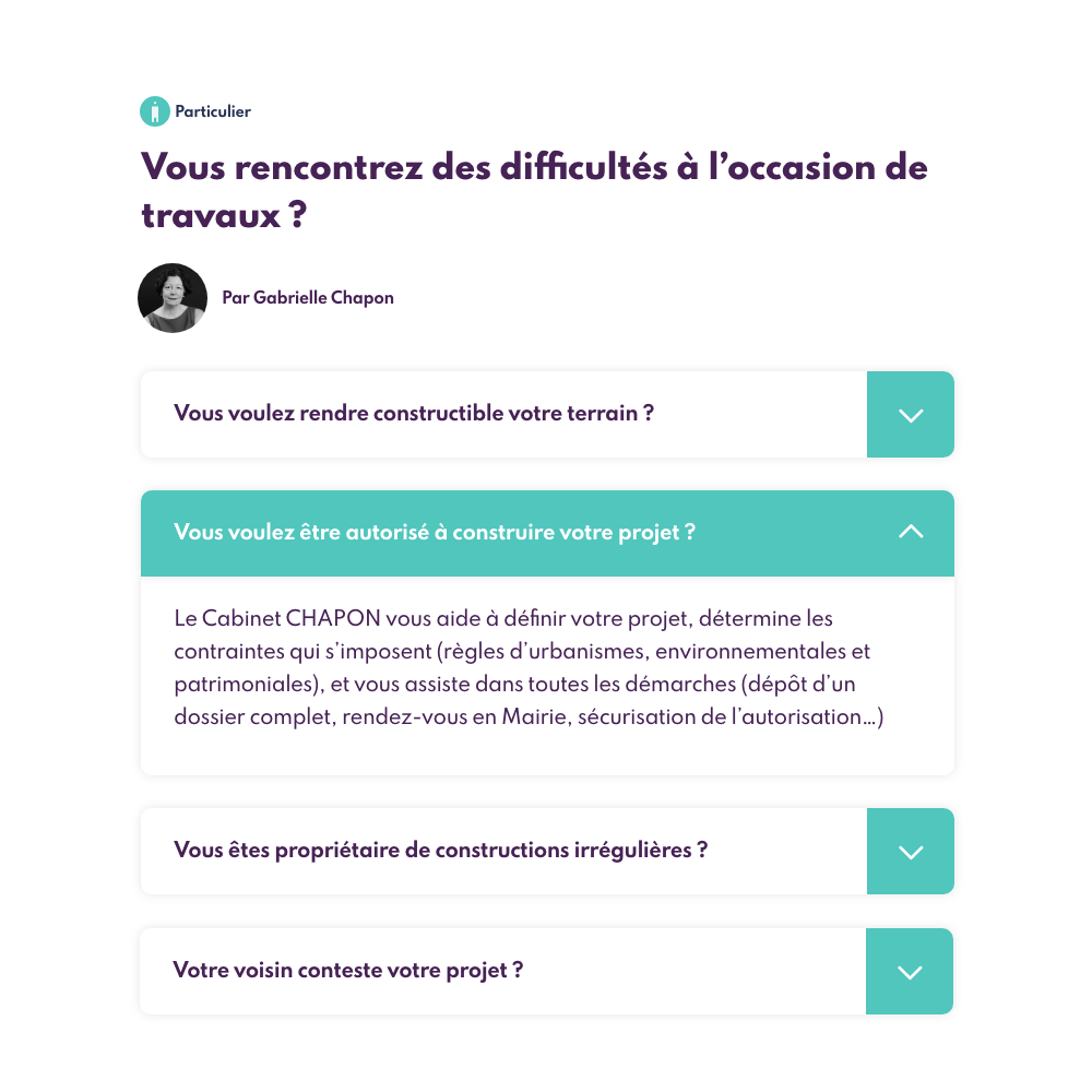 Chapon Avocats Conseils est un cabinet d’avocats indépendant spécialisé dans le droit public et l’urbanisme. Ils proposent des services en conseils et assistance juridique à tout type de public et organisation : particuliers, entreprises, administrations, associations.