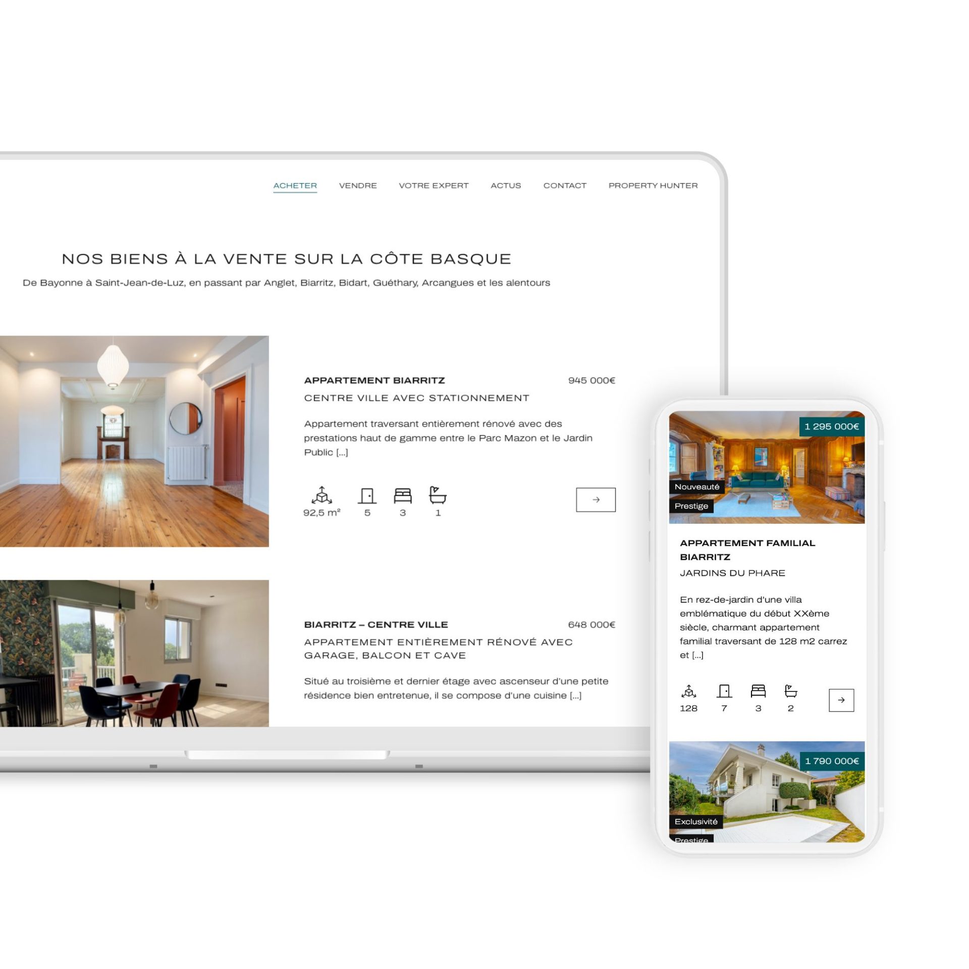 Le site web devient plus contemporain avec un design épuré et esthétiquement plus attrayant. Les couleurs choisies reflètent l’élégance et la convivialité, tandis que la mise en page met en valeur les biens disponibles.