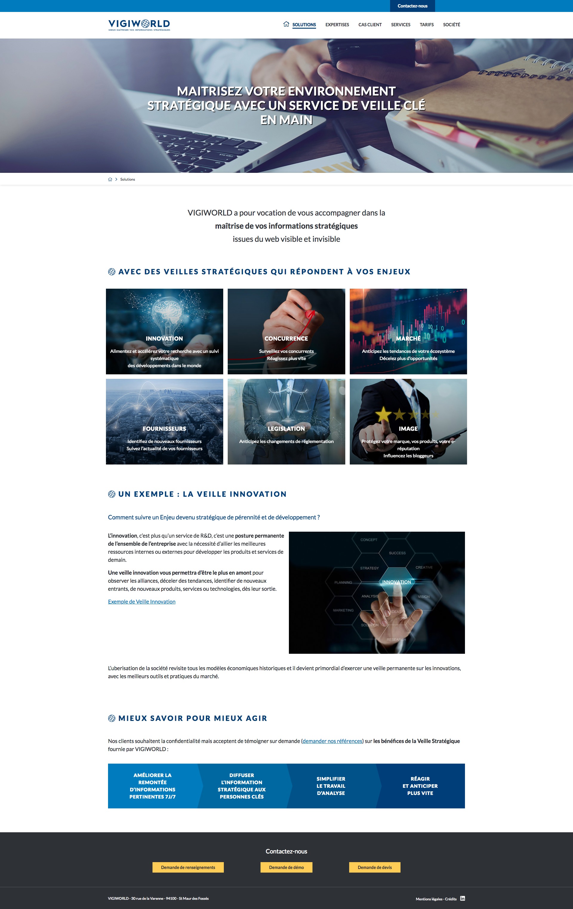 Nous nous sommes également chargé d’une recherche iconographique afin d’illustrer les pages du site de Vigiworld et de valoriser l’activité. Tout le travail d’illustration et les échanges sur le contenu proposé par le client pour construire son site ont permis une remise en forme complète de la présentation de l’offre du client sur tous les supports de communication qu’il utilise par ailleurs.