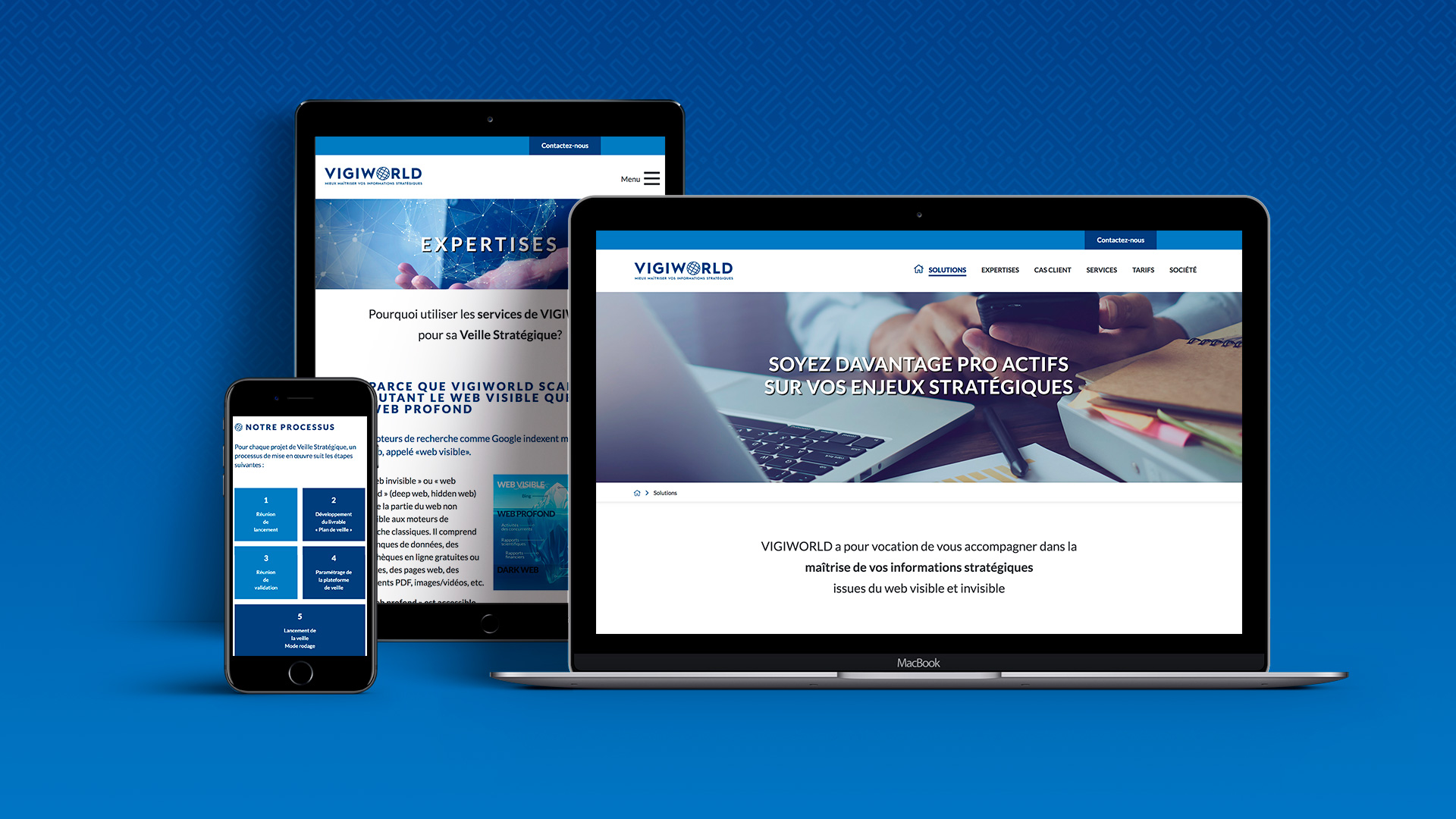 Notre webdesigner a proposé une refonte de l’identité visuelle de Vigiworld afin de moderniser son image. Il a donc réalisé une charte graphique complète incluant le logo, de nouvelles règles de codes couleurs qui renforcent le positionnement de l’entreprise tout en adoptant une approche graphique beaucoup plus actuelle. Ces principes et ces éléments graphiques ont permis de concevoir une déclinaison complète que l’on retrouve dans le webdesign du site qui s’adapte aux supports de lecture sur PC, tablette ou mobile.